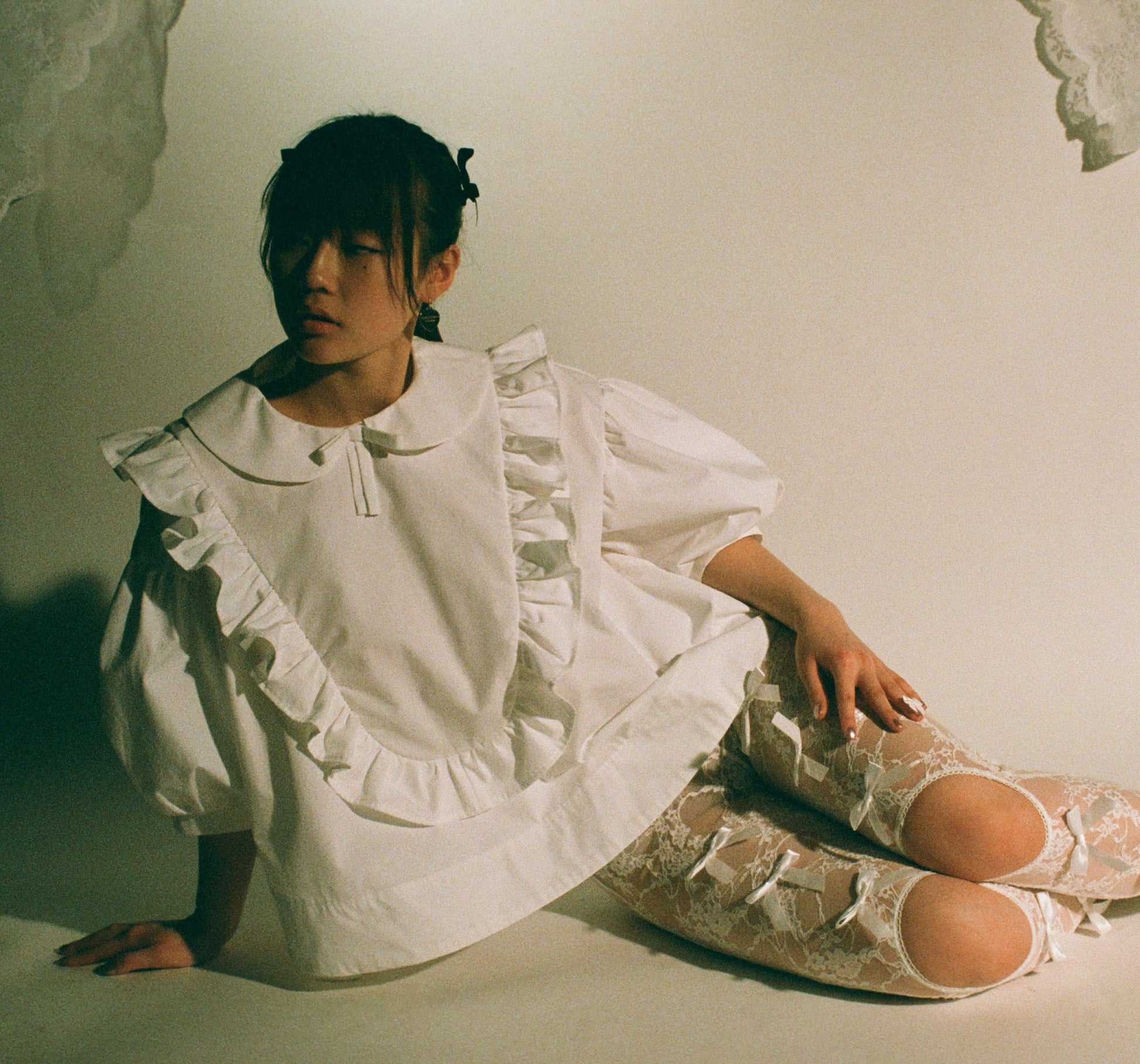 boxy top with ruffled bib, rounded collar, and puffy sleeves